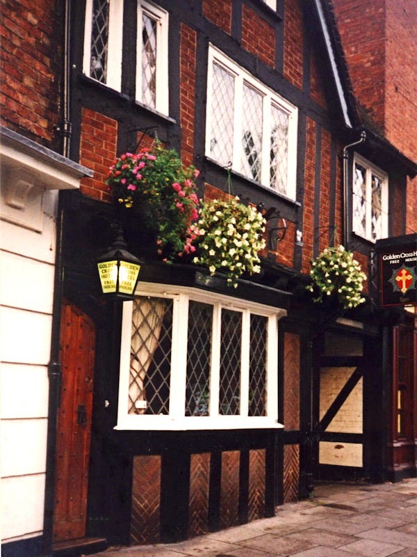 Another plus for the Golden Cross? Its sometimes willful disregard for the strict closing hours of English pubs, 10:30 or 11:00PM at the time. Far too early for young people out on weekends with energy to spare. The place still stands, as it has since the 15th century. Here’s how it looked when I was there: