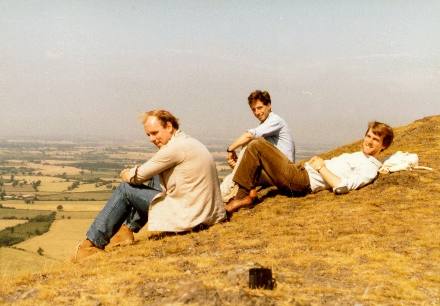 And the pull of the place was strong: just one year after departing Shrewsbury, between the first and second years of medical school, the two of us went to visit the school. Improbably, I’d landed a job writing travel literature for an international bus tour company, and they placed me in Britain.3 Here’s a picture of Gordon, David, and me at the top of a nearby hike: